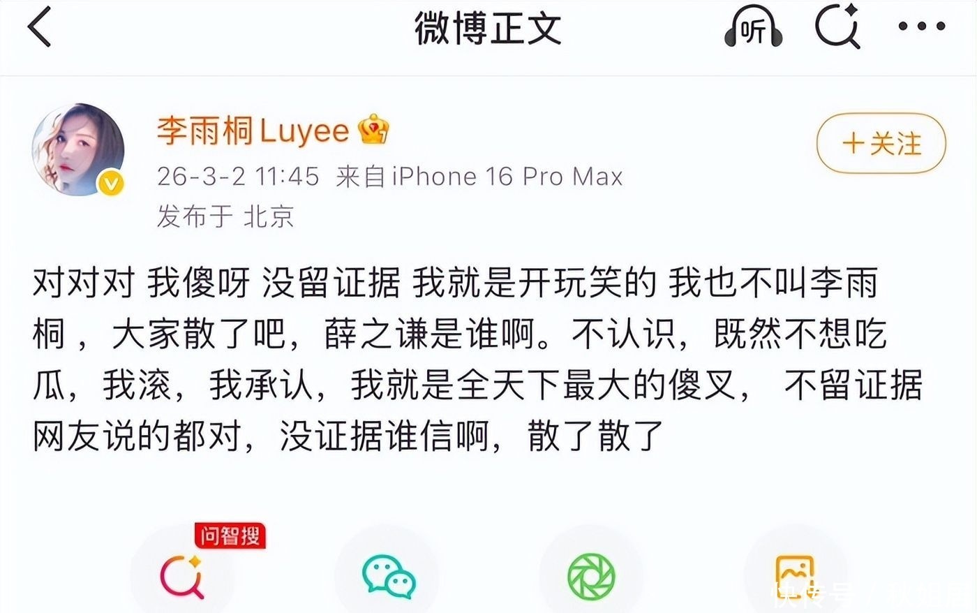 她称此前内容“并无实质证据支撑”“纯属情绪宣泄”,劝网友“不必当真”“各自散去”,末了自嘲一句:“我大概是这世上最不讲逻辑的糊涂蛋。”随后删减部分原文,只余悬念重重的残局,令围观者愕然失语。