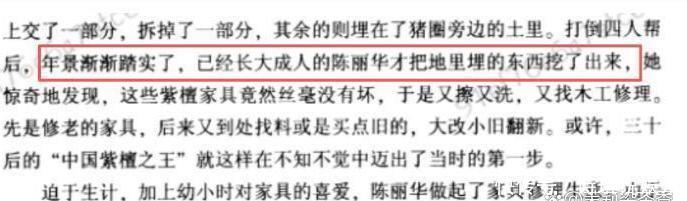 陈丽华来自一个普通家庭,小时候曾看到紫檀木埋在泥土里,表面还留着细致的雕刻痕迹,觉得挺可惜的。